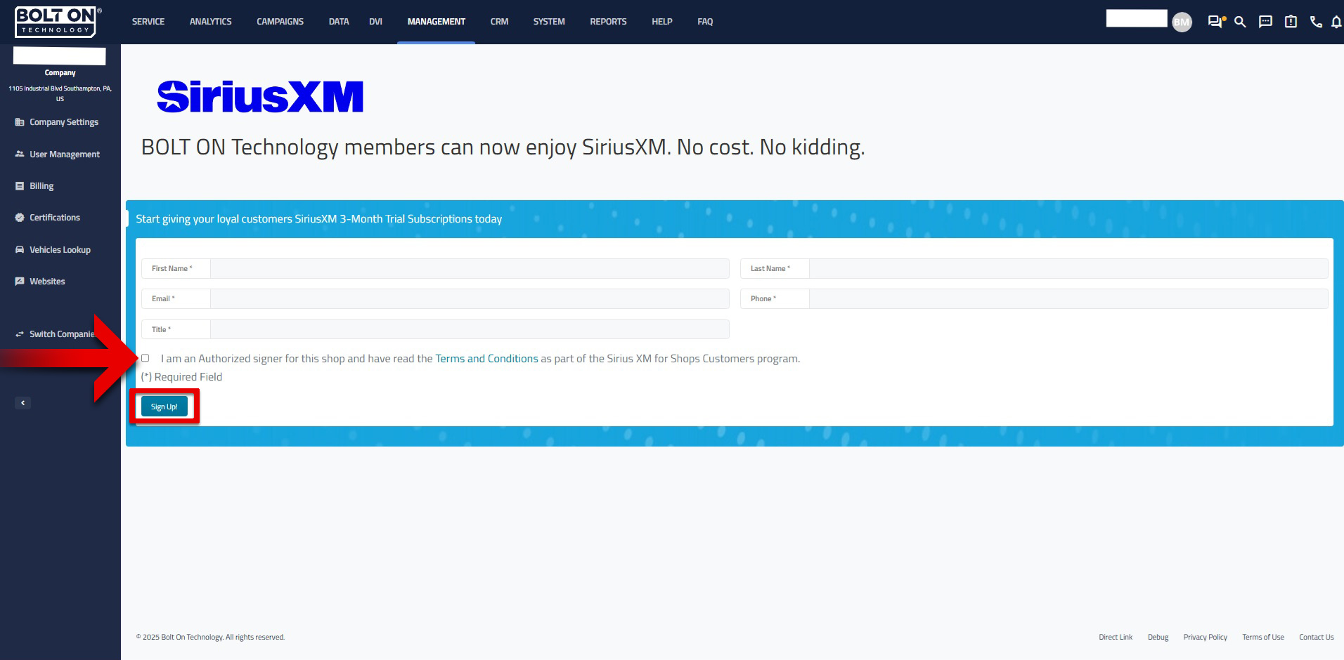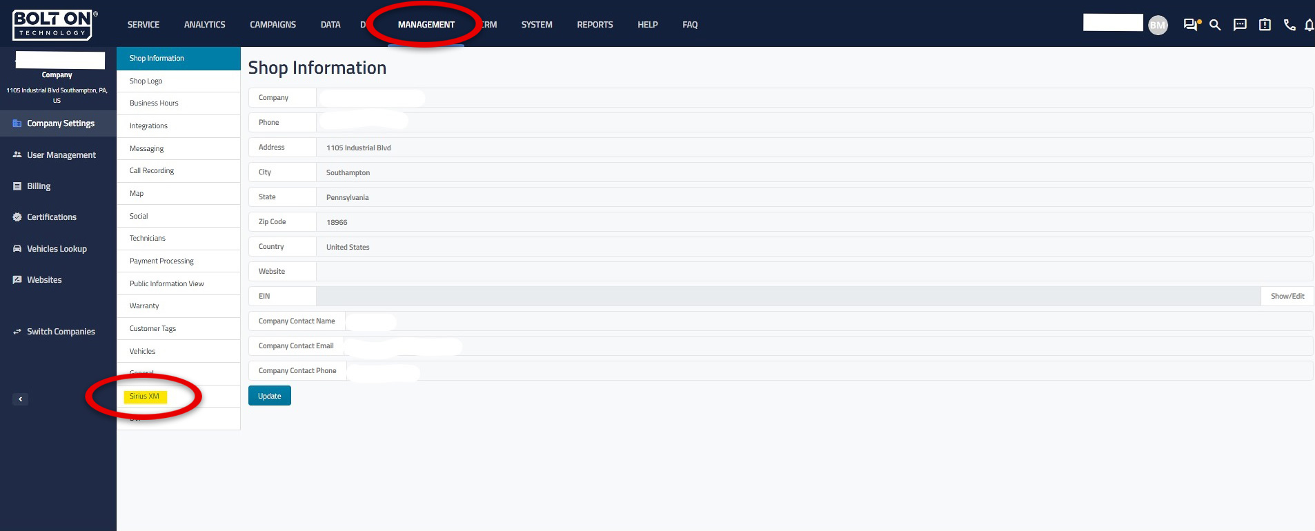 From the top navigation, select “Management”, then “Company Settings”, and find “SiriusXM” under “Shop Information.”