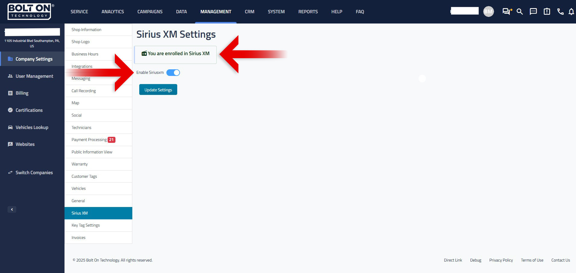 To double-check that you’re all set up, go back to “Management” in the navigation menu, select “Company Settings,” and look for “SiriusXM” under the “Shop” page. You should see the message: “You are enrolled in SiriusXM” and confirm the “Enable SiriusXM” toggle is switched on.